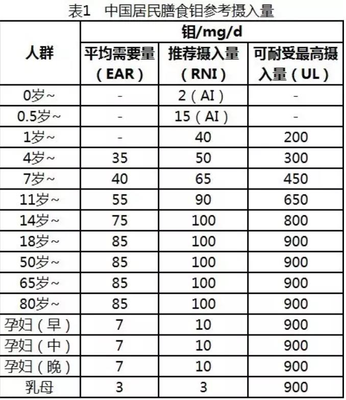 中國營養學會編製的《中國居民膳食營養素參考攝入量》中鉬的參考攝入量見下表: